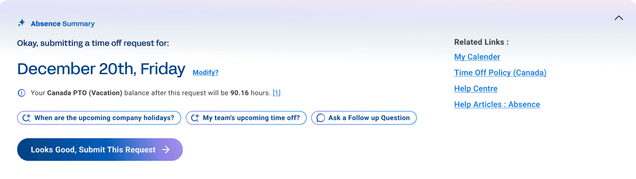 When the system detects a Do intent, the AI summary becomes the task entry point. Such as opens a date selector pre-filled with your time off balance, you just confirm, and the action completes.